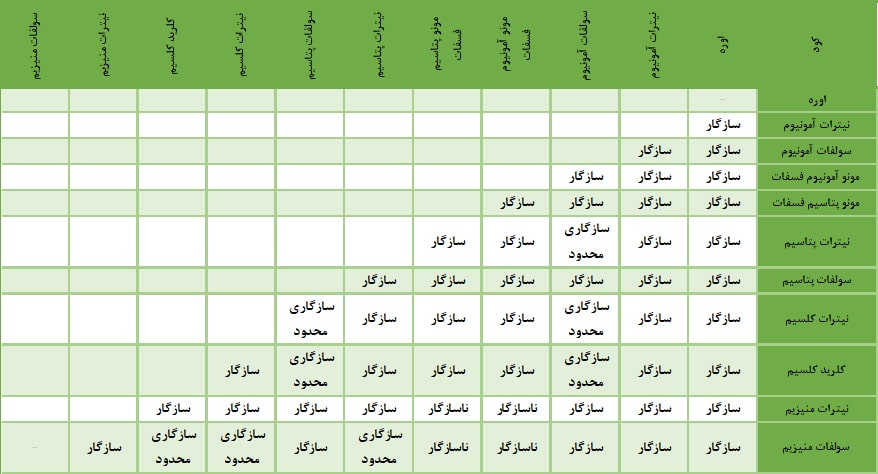 در جدول زیر به شرایط سازگاری و ناسازگاری کود های رایج در تغذیه برگی اشاره شده است.